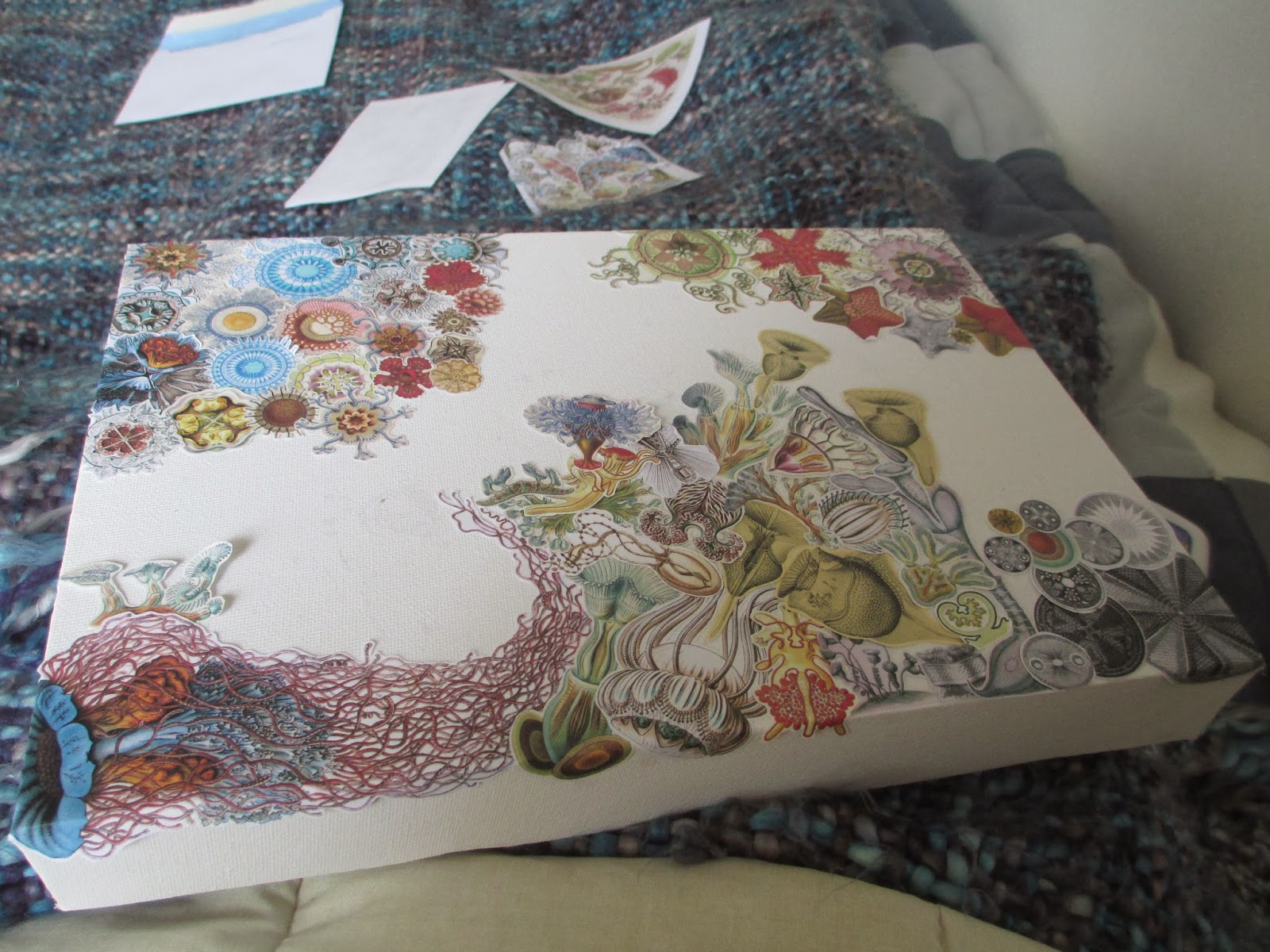 Decidi fazer um quadro com essa mesma temática. Para isso pesquisei pela Internet desenhos científicos de invertebrados, depois imprimi, cortei e depois foi achar o melhor lugar para cada ser vivo.
